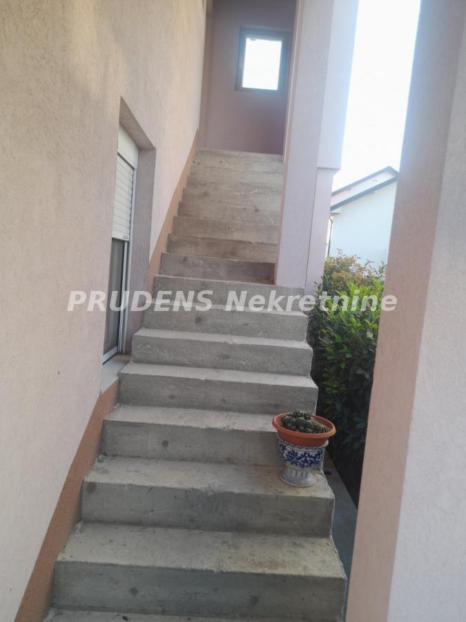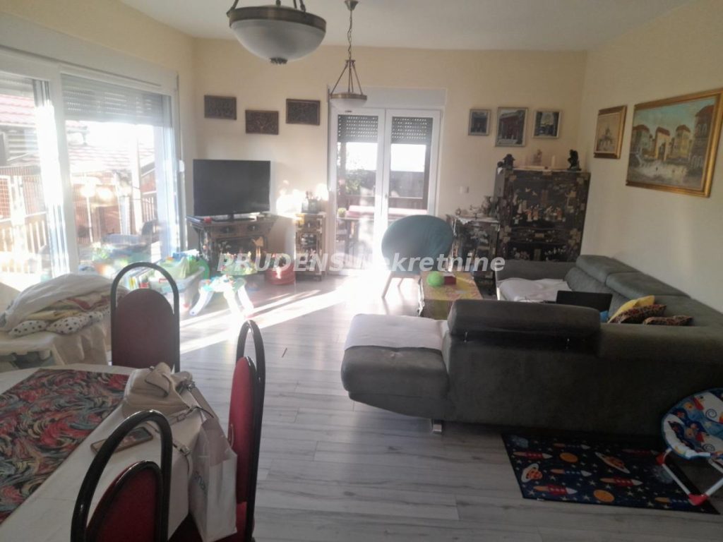Atraktivna, vrlo intetesantna spratna kuća površine u prizemlju 147m2 + 96m2 u potkrovlju do kojeg se stiže spoljnim, pokrivenim stepenicama. Potkrovlje je u grubim radovima i traži određeno ulaganje. Prizemlje kuće je vrlo bogato urađeno i sastoji se od zadebnog antrea, raskošnog, velikog dnevnog boravka, osunčanog, svetlog, u zelenilu uređenog dvorišta koje nalikuje izolovanom parku. U sklopu dnevnog boravka nalazi se uređena kuhinja sa komplet belom tehnikom, kao i izdvojena manja trpezarija takođe ukusno i prijatno nameštena. Zid u dnevnom boravku okrenut ka dvorištu je u staklu presvučen pvc roletnama.
